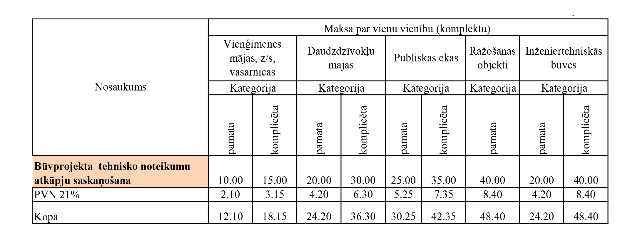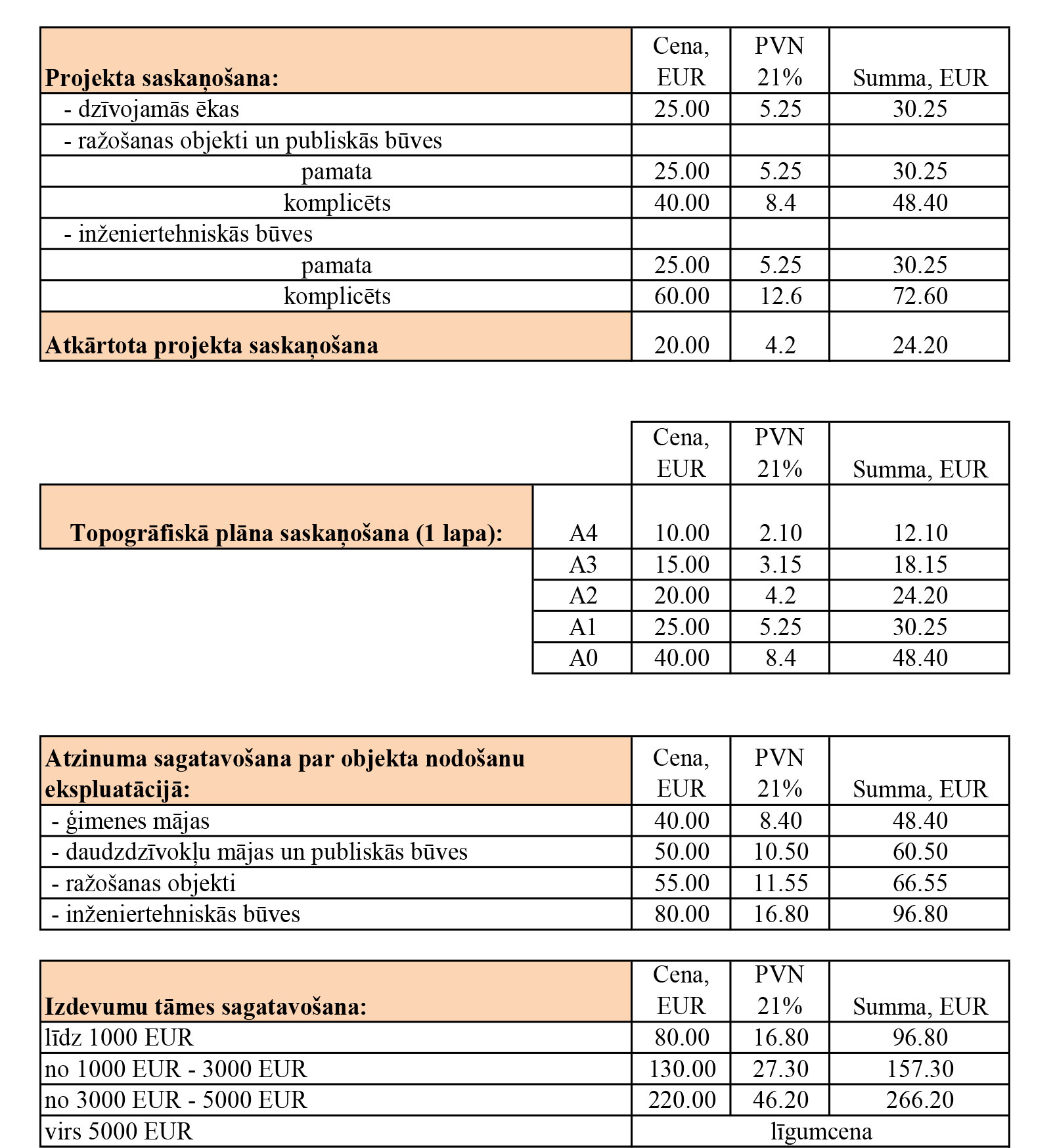 | Nosaukums | Cena, EUR | PVN 21% | Summa, EUR |